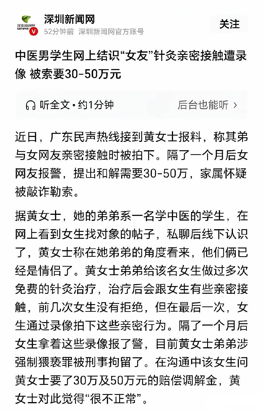 爱游戏,爱游戏体育,爱游戏平台,爱游戏娱乐,爱游戏官网,爱游戏官方网站,ayx爱游戏平台,爱游戏app,爱游戏体育app,爱游戏app下载,爱游戏体育官网,爱游戏体育app下载,爱游戏体育网页版,爱游戏官方入口,爱游戏手机APP广东一名中医男学生小黄,通过网络交友结识一女子并发展为情侣,多次免费为女友针灸,治疗中的亲密接触也未遭对方拒绝。不料女子悄悄录下最后一次亲密行为,一个月后持录像报警,指控小黄涉嫌强制猥亵罪,导致小黄被刑拘,女子还向其家属索要30万至50万元赔偿。家属质疑这是敲诈勒索圈套,警方已建议收集证据并依法调查,事件真相引发热议。 一、情侣间的免费针灸,藏着致命圈套? 小黄是个钻研中医的男生,除了琢磨医术,也想找个合得来的对象。网上刷到女生的交友帖后,他主动私信搭讪,两人线上聊得投缘,线下见面后,小黄便认定彼此是情侣关系,这份缘分让他格外珍惜。 得知女友身体不适,小黄二话不说提出免费针灸治疗——毕竟是自己的专业,还能为爱人分忧,何乐而不为?前几次针灸时,两人难免有亲密接触,女生全程没拒绝,这让小黄更确信感情稳定,压根没察觉到任何异常。 可他万万没料到,最后一次针灸的亲密行为,竟被女友悄悄录了下来。一个月后,警方的通知打破了所有平静:女生拿着录像报警,说小黄强制猥亵她!小黄直接被刑事拘留,这个消息让姐姐黄女士彻底懵了,她怎么也不信老实的弟弟会做这种事。 更离谱的是,女生报警后主动联系黄女士“调解”,张口就要30万到50万赔偿款。黄女士越想越不对劲:真要是受了伤害,哪会狮子大开口要这么多?这分明就是借着报警设圈套,想敲诈勒索!无奈之下,黄女士只能找记者求助,盼着能查相,还弟弟清白。